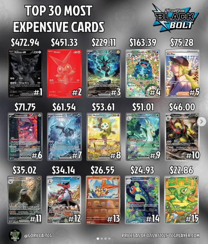 7월 18일에 북미판/영문판 블랙볼트와 화이트플레어가 발매되었고 며칠 전인 7월 28일 기준 블랙볼트의 카드 가격/시세는 아래와 같다.